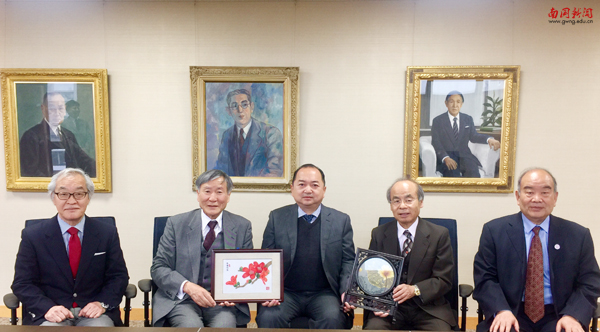 丁小军董事长(中)与爱知东邦大学董事长兼校长榊直树(左二)互赠礼物并展开会谈