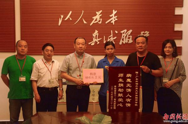 本网讯 一人有难众人帮,爱心捐助渡难关。自从我校清洁工何凤群的女儿不幸罹患生殖细胞瘤的消息经微信朋友圈、学校工会、团委等传播后,受到了全校师生员工、校友及社会人士的广泛关注和慷慨解囊。4月21日上午,校党委书记黎冬代表学校将善款46414.2元交到了何凤群的手中。