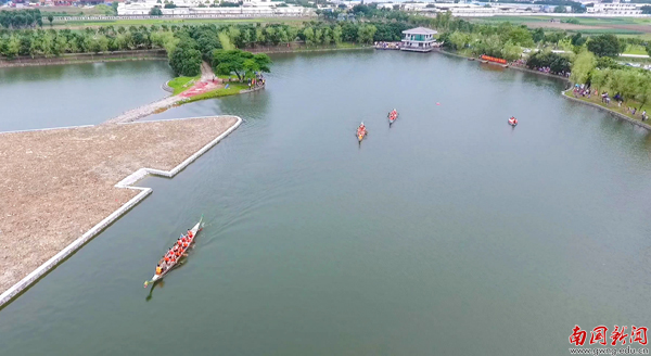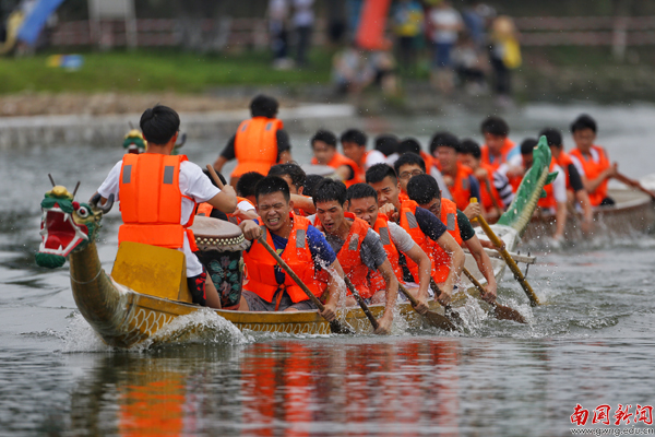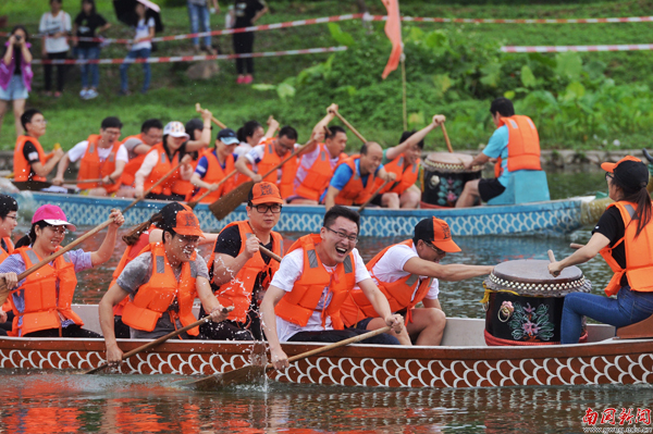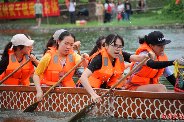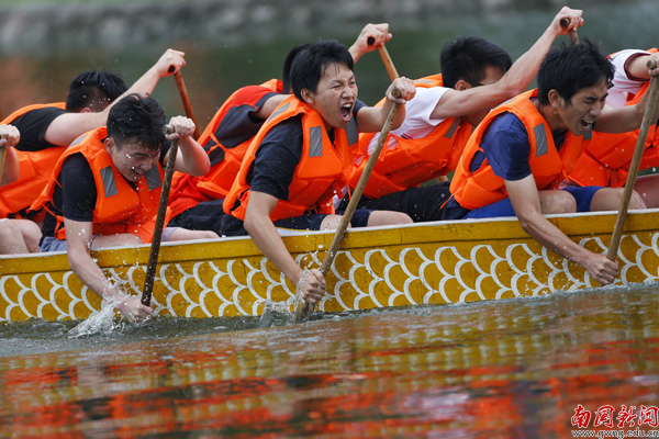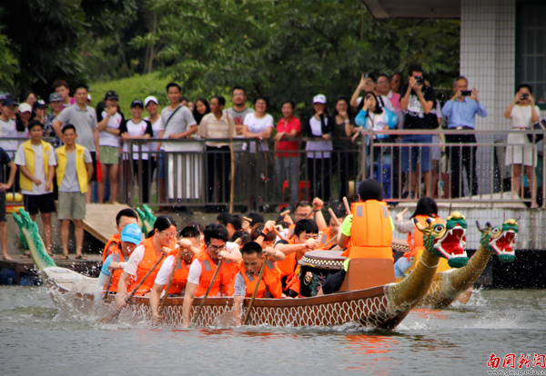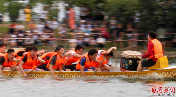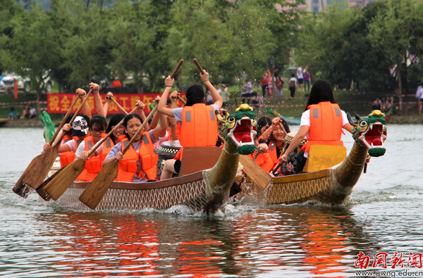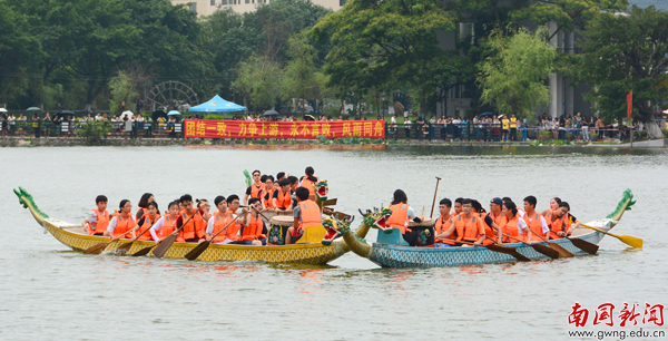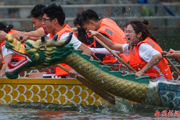 【编者按】鞭炮隆隆鼓声稠,端阳佳节赛龙舟。5月25日是我校第七届龙舟赛开划的第二天,教工组9支队伍亮相,与入围决赛的18支学生队伍分组竞渡,每支参赛队伍都士气昂扬,现场更有我校俄罗斯美外教Mariia与《广州日报》全媒体记者对比赛做网上直播。当天激烈赛况、热闹场面尽在记者镜头里重现。