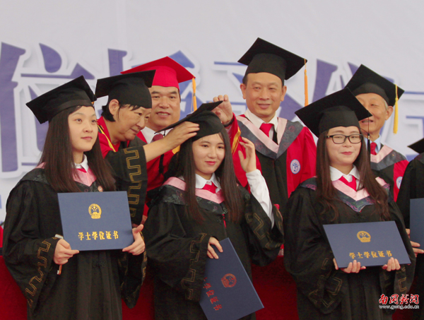 校歌声中,获得学士学位的学生分组一一上台受礼,校长焦方太等与受礼学生亲切握手,为其拨穗并颁发学位证书。