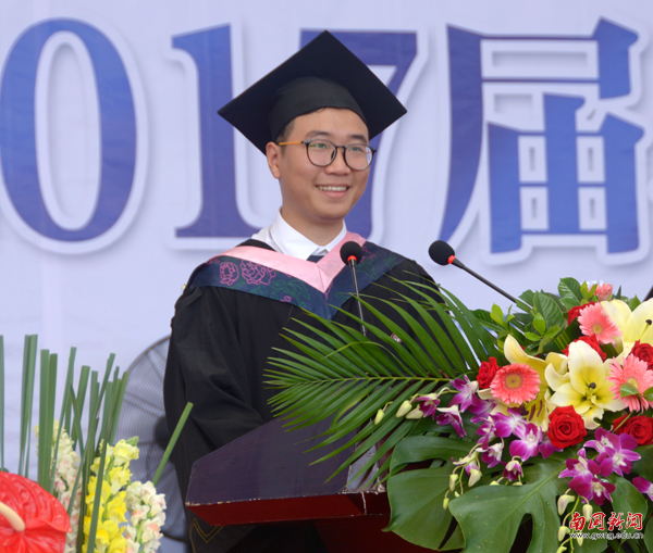 2013级西方语言文化学院德语一班的吴扬宇作为毕业生代表发言。他回忆起大学生活的点点滴滴,说:“我们一定会秉承‘明德尚行,学贯中西’的校训,用我们在南国所学的知识,勤于实践,踏实做事,在不同的工作岗位上奋斗拼搏为母校争光添彩,用我们的努力来回报社会,回报母校。”