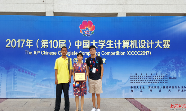 本次大赛分为数字媒体组、软件服务外包组、软件应用与开发等8个组,来自北京大学、武汉大学、华中科技大学等200多所本科院校的500余支队伍参加比赛。我校2015级计算机科学与技术专业的宋彪、邓政以及数字媒体技术专业的许佳阳3位同学的设计作品“帮你拿APP”在软件应用与开发组的全国总决赛中,凭借作品完善的功能和优秀的现场答辩斩获佳绩。