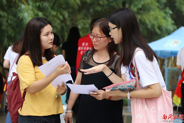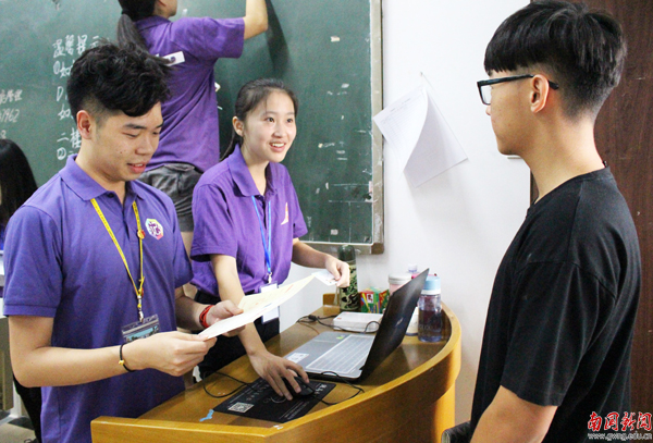 在师姐的指导下认真填写资料(何嘉颖 摄)