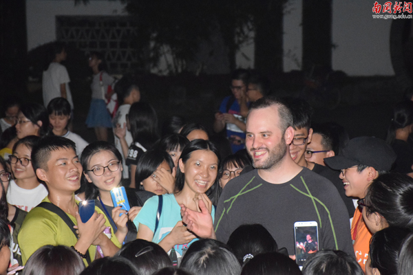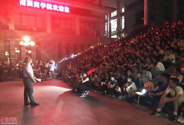 本网讯 10月11日晚,由英语语言文化学院与大学英语教学部共同举办的英语角在教学楼F、G栋前的广场上拉开帷幕。英文学院副院长陈胜教授、外教Charles以及Benjamin与全校400多名学生参加了活动。本次活动以“Guangdong and Hometown”(广东与家乡)为主题,近两万字的题材资料提前两日向学生发布,让同学们在充分了解相关知识的基础上围绕本话题畅所欲言。