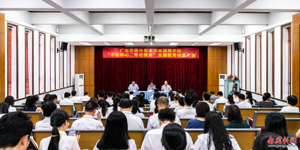 省委教育工委巡回指导组陈杰副组长作指导讲话。她指出,广东外语外贸大学南国商学院是第二巡回指导组负责联系的六所学校之一。按照省委和省委教育工委部署要求,学校成立主题教育领导小组,黎冬同志认真落实第一责任人职责,制定的方案既体现了中央和省委精神,又符合本校实际。从整体看,主题教育前期工作扎实认真、有序推进。随后,陈杰就落实主题教育各项任务,提出五点意见:一要切实提高思想认识,不忘初心、牢记使命,是加强党的建设的永恒课题,是全体党员、干部终身课题;二要牢牢把握总体要求,聚焦深入学习贯彻习近平新时代中国特色社会主义思想这个根本任务,贯彻“守初心、担使命,找差距、抓落实”这个总要求,坚持抓思想认识到位、抓检视问题到位、抓整改落实到位、抓组织领导到位,以彻底的自我革命精神解决突出问题,努力实现“五句话”的具体目标;三要一体推进四项重点措施,学校领导班子和领导干部要在学习教育、调查研究、检视剖析、整改落实上坚持更高标准、更严要求,充分发挥示范带动作用;四要着力解决突出问题,第二批主题教育安排不少于3个月时间,如何在有限时间内实现预期目标,关键是在解决突出问题上怎么求实效;五要强化组织领导,学校党委要切实扛起责任,加强领导指导,层层传导压力,注重典型引路,坚决把中央部署和省委要求传达落实到每个支部、每名党员。