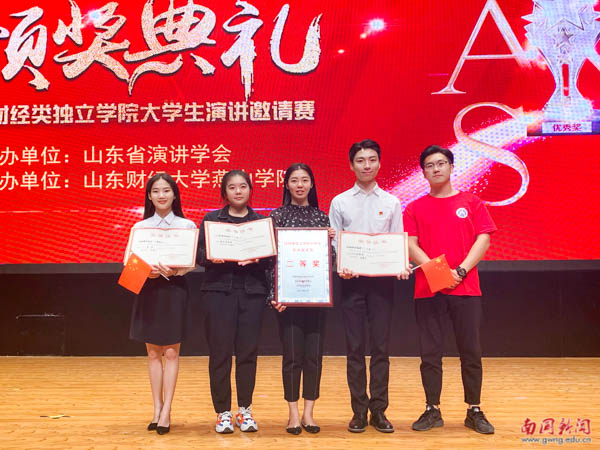 本网讯 9月21日,“我和我的祖国”讴歌新中国成立七十周年全国财经类独立学院大学生演讲邀请赛在山东举行。我校2017级葡萄牙语专业曹喜彤同学荣获个人一等奖,2016级市场营销(双语教学)专业吴沁蓉同学荣获最佳应变奖,2017级西班牙语专业许腾同学荣获个人优秀奖,我校总分荣获团体二等奖。