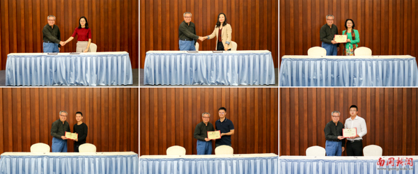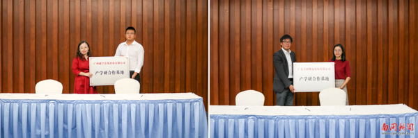 随后,蒋院长与6家校企合作单位负责人分别签订了《共建产学研基地协议》;院长助理党雪老师接受了“广州就学在线科技有限公司”产学研合作基地牌匾;院长助理李玥老师接受了“广东天图物流股份有限公司”产学研合作基地牌匾,此外,蒋院长还向企业代表颁发了专业顾问的聘书,向文英女士颁发了客座教授聘书。