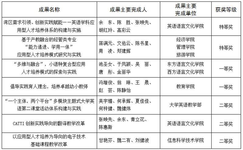 根据《广东外语外贸大学南国商学院校级教学成果奖励办法》和《关于开展第四届校级教学成果奖申报工作的通知》,学校组织了第四届校级教学成果奖评审工作。经各单位申报、校内外专家评审、教学指导委员会认定、党政联席会议审定,评出特等奖2项、一等奖2项、二等奖3项。现将获奖名单予以公示。