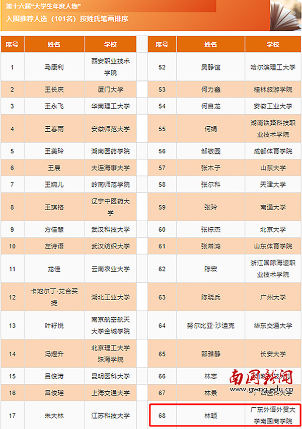 本网讯 近日,由教育部、人民日报社共同指导,人民网、光明日报教育部、《大学生》杂志和中国大学生在线联合主办的第十六届“大学生年度人物”推选展示活动评选结果揭晓,经组织推荐、通讯推选、会议推选等环节,共遴选出年度人物候选人20名,年度人物提名候选人30名,年度人物入围候选人101名,我校中国语言文化学院林颖同学成功入围“大学生年度人物”推荐人选。