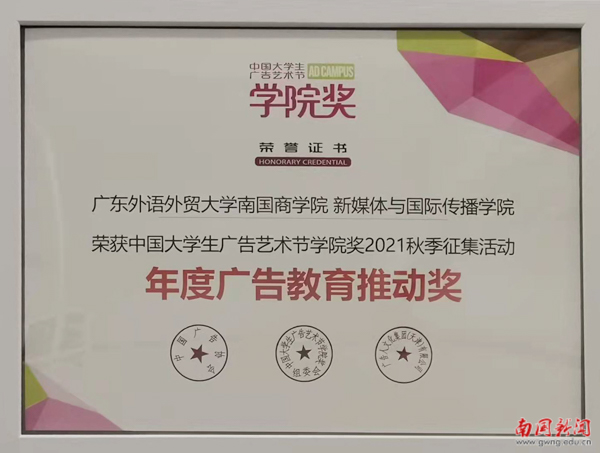 本网讯 近日,中国大学生广告艺术节学院奖组委会公布2021秋季征集大赛比赛结果。我校新媒体与国际传播学院首次参赛,表现惊艳!在全国1240多所高校40余万件作品中,新媒体与国际传播学院共有148件作品获奖,其中国家级银奖1项,优秀奖26项,入围奖121项。这是我校首次摘取“学院奖”全国银奖!新媒体与国际传播学院荣获中国大学生广告艺术节学院奖2021“年度广告教育推动奖”。