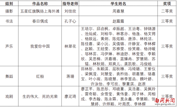 周嘉慧同学的摄影作品《五星红旗飘扬上海外滩》获得广东省高校艺术作品征集展演活动艺术作品类二等奖,赵露露同学的书法作品《春日偶成》获得广东省高校艺术作品征集展演活动艺术作品类三等奖;学生合作的声乐作品《我爱你中国》、舞蹈作品《红船》以及戏剧作品《生的伟大,死的光荣》荣获艺术表演类三等奖。