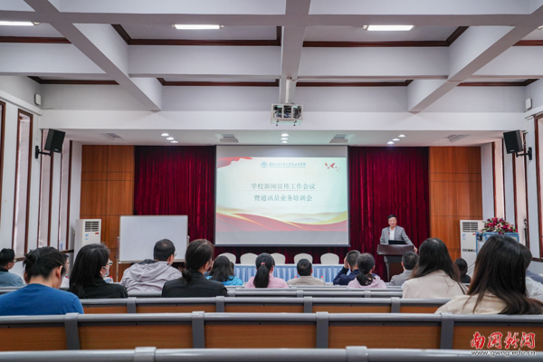 本网讯 11月23日上午,我校在F101学术报告厅召开新闻宣传工作会议暨通讯员业务培训会。赵福春副校长出席会议并对如何做好新闻宣传工作进行指导,宣传部负责人孔晓明对学校近期发布的新闻宣传管理办法进行解读并对学校通讯员进行培训。学校相关部分负责人、各学院党组织负责人、各单位通讯员和党委宣传部全体工作人员参加会议。