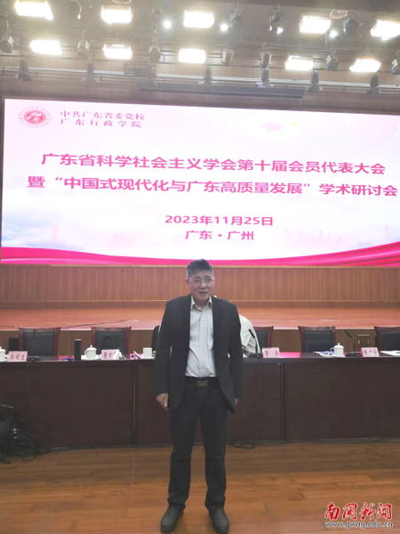 本网讯 11月25日,广东省科学社会主义学会第十届会员代表大会暨“中国式现代化与广东高质量发展”学术研讨会在省委党校举行。我校马克思主义理论一级学科带头人詹文都教授再次当选副会长,并在大会上作主旨演讲。