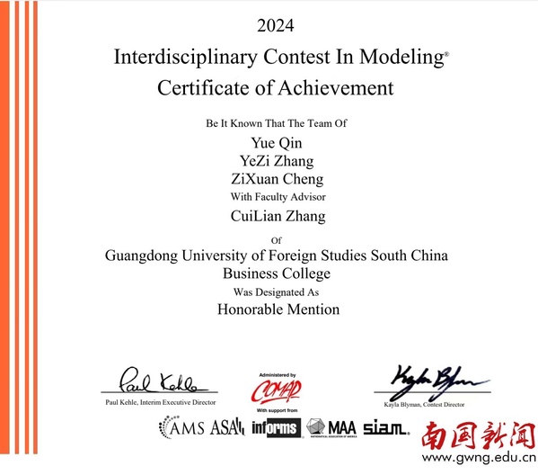 此次比赛自2023年11月启动,计算机学院数学教研室从数学建模协会精心选拔队员,并组织开展系统培训。参赛选手在指导教师章翠莲老师的带领下团结协作,合力攻关,在国际大学生学科竞赛舞台上展现了我校学子的风采,反映出我校在创新人才培养模式改革中取得的积极进展。