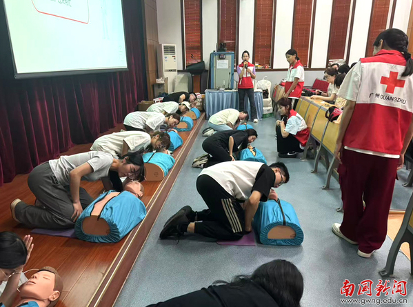 培训现场,来自广州市红十字会的专业讲师团队为参训学员进行了全面系统的急救知识讲解。培训内容涵盖心肺复苏(CPR)操作规范、自动体外除颤器(AED)使用技巧、创伤急救处理等实用技能。在实操演练环节,讲师们通过模拟真实急救场景,手把手指导学员进行实践操作,确保每位学员都能掌握正确的急救方法。值得一提的是,通过考核的学员将获得广州市红十字会颁发的《红十字救护员证》,进一步增强校园急救保障力量。