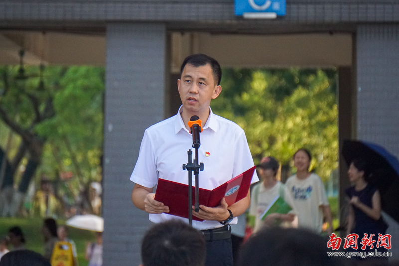 仪式上,校团委书记王黎明发表讲话。他首先总结过去一年,我校师生奋楫争先,在各项工作与赛事中取得多项荣誉;同时提及,在即将到来的第十五届全运会和第十二届残运会暨第九届特殊奥林匹克运动会上,南国青年将再度出发,续写辉煌篇章。随后,王黎明鼓励南国青年深刻认识自身肩负的时代责任,并提出三点希望:一是坚定理想信念,厚植家国情怀;二是勤学苦练本领,投身伟大实践;三是勇担时代重任,展现青年作为。讲话最后,他寄语全体同学:“生逢盛世,当不负盛世!”