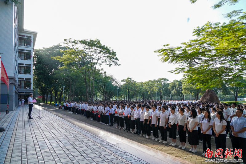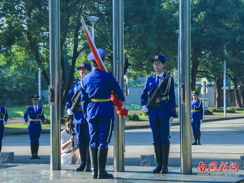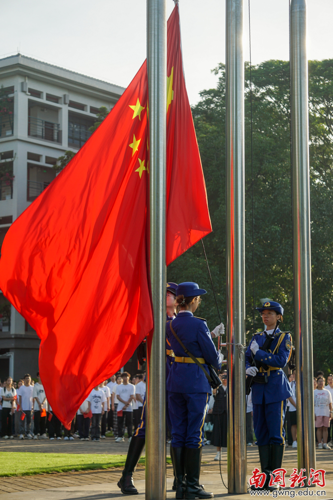 本网讯 为庆祝中华人民共和国成立76周年,我校于9月29日清晨在C栋教学楼前广场举行国庆升旗仪式。校团委书记王黎明,部分学院党总支书记、直属党支部书记,各学院团委书记,校团委全体老师与部分辅导员老师,以及学生干部、学生代表共同参加本次活动。仪式中,全体青年学子庄严举起右拳,以“请党放心,强国有我!请祖国放心,复兴有我!”的铮铮誓言,表达坚定理想信念、勇担时代使命的青春决心,展现了南国学子深厚的家国情怀与奋发有为的精神风貌。