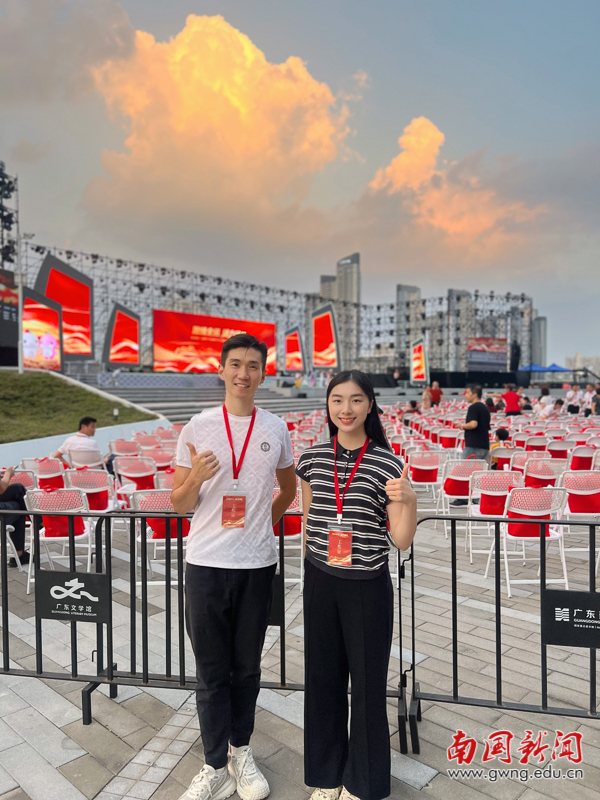 广东外语外贸大学南国商学院艺术学院国家一级演员任楠老师、邓诗琪老师受邀担任核心工作人员,深度参与演出筹备与执行。汇演汇聚荔湾区教育系统师生及福建龙岩武平县师生代表等逾千名演员同台献艺,场面盛大热烈。两位教师以专业素养和饱满热情投入台前幕后工作,全程高效协作,不仅保障了演出圆满完成,更以实际行动展现了学院教师卓越的艺术水准与担当精神,为这场湾区艺术盛会注入了“南国艺术力量”。