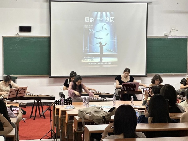 回到广外南国的课堂,这些培训感悟很快转化为生动的教学实践。“同学们知道《沧海一声笑》里运用的是调式什么吗?‘宫’‘商’‘角’‘徵’‘羽’,这是我们中国传统音乐里最常见的五声调式。生活里藏着太多这样的文化密码。”在《中国民族器乐赏析》课上,杨箫铭总爱用这类贴近生活的例子拉近学生与非遗的距离。她清楚,年轻一代对非遗的认知往往始于好奇,课堂正是播撒文化种子的最佳土壤。