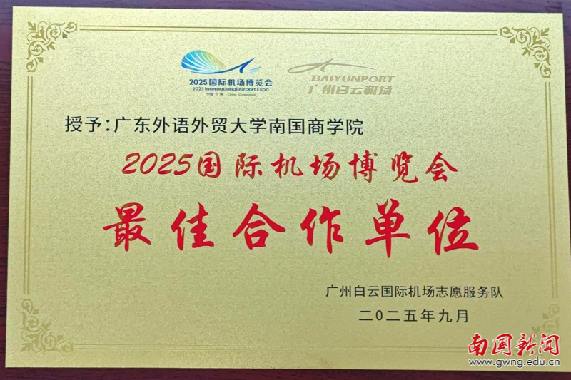 本网讯 近日,我校收到来自广州白云国际机场志愿服务队的感谢信与“2025国际机场博览会最佳合作单位”牌匾。这既是对文化与传播学院志愿者团队历时近半年、全程深度参与博览会服务的嘉奖,也是对我校实践育人与组织协调工作的充分肯定。