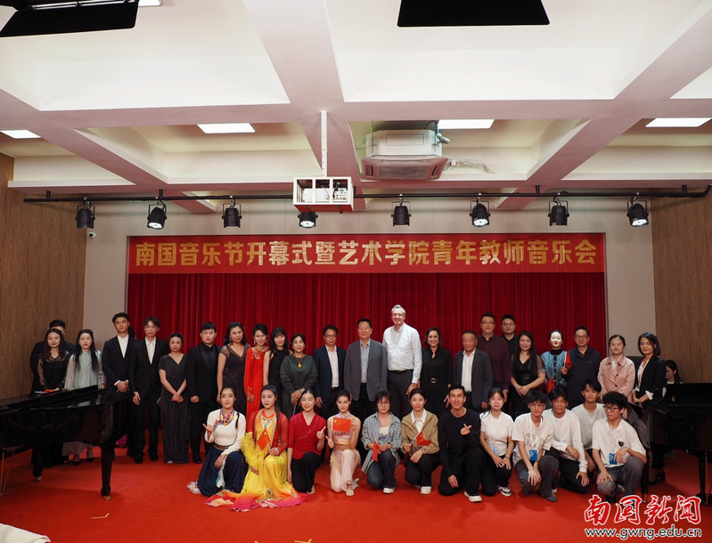 本网讯 10月23日,第二届南国音乐节正式启幕。本届音乐节以“动人的旋律——讲中国故事”为核心主题,深度融合琴乐、声、舞等多元艺术形式,为师生打造了一场兼具思想厚度与艺术张力的视听盛宴,美国哈丁大学副校长David Collins、国际交流办公室主任,东亚部主任凌雄辉。广东外语外贸大学南国商学院党委书记许志超、副校长王铭玉教授,副校长陈林汉教授,院系领导及师生齐聚现场,共同见证这一艺术盛会的开幕时刻。
