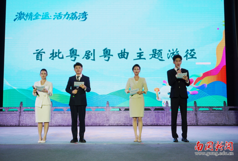 本网讯 “Now, let’s embark on this cultural journey together!”10月27日下午,伴随着粤剧艺术博物馆舞台上的悠扬韵味,我校旅游管理专业学生钟梓杰、杜嘉茵以流利自信的英语主持,为“激情全运 活力荔湾”文旅体产业融合发展宣推活动奏响了国际化表达的精彩序章。