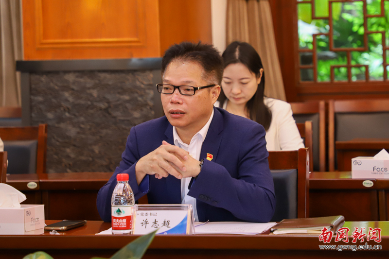 许志超首先代表学校党委对黄秀娟一行的到来表示热烈欢迎,并对广外在上一轮结对共建工作中对我校给予的倾力指导与帮扶致以衷心感谢。他指出,本次会议既是对首轮共建成果的深化巩固,更是两校携手贯彻落实中央和省委关于加强高校党建与思想政治工作最新决策精神的务实举措。许志超回顾了上一轮结对共建的丰硕成果。他表示,在广东外语外贸大学的精准指导与大力帮扶下,学校党建与思政工作取得显著成效,相关成功经验获得了省委教育工委的充分肯定,被列为可复制、可推广的先进模式。面向新一轮共建,为切实提升合作实效,许志超提出,学校已部署各相关部门全面梳理当前最紧迫、最核心的发展需求,旨在聚焦有限目标,精准提出亟待帮扶的关键事项,期望能与广东外语外贸大学携手,实现资源对接更精准、支持帮扶更高效,共同推动共建工作再上新台阶。