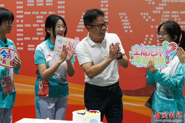 慰问当日恰逢多名志愿者生日,许志超书记与在场领导一同为“南国小海豚”寿星们送上祝福,共同切开甜蜜的生日蛋糕,让志愿者们在紧张的服务间隙感受到家一般的温暖。随后,全体人员在志愿者之家合影留念,许志超书记在签名墙上郑重签名,定格下这段承载青春与责任的珍贵记忆。