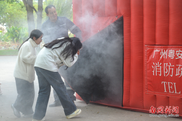 理论学习结束后,师生分批转移至学校射羿场的模拟火情现场,开展实战化实操演练。演练现场设置了烟雾模拟逃生通道和模拟火灾点,还原了真实火灾场景中的烟雾弥漫环境。在张老师的指导下,学生们按照“低姿弯腰、捂住口鼻、有序撤离”的要领,依次通过烟雾通道,顺利完成逃生演练。