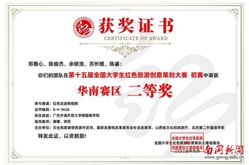本网讯 近日,第十五届全国大学生红色旅游创意策划大赛圆满落幕。由我校学生邓雅心、陈俊杰、余明浩、苏忻翘、陈睿组成的参赛团队,在“红色足迹微视频”赛道中表现出色,其参赛作品荣获华南赛区二等奖。