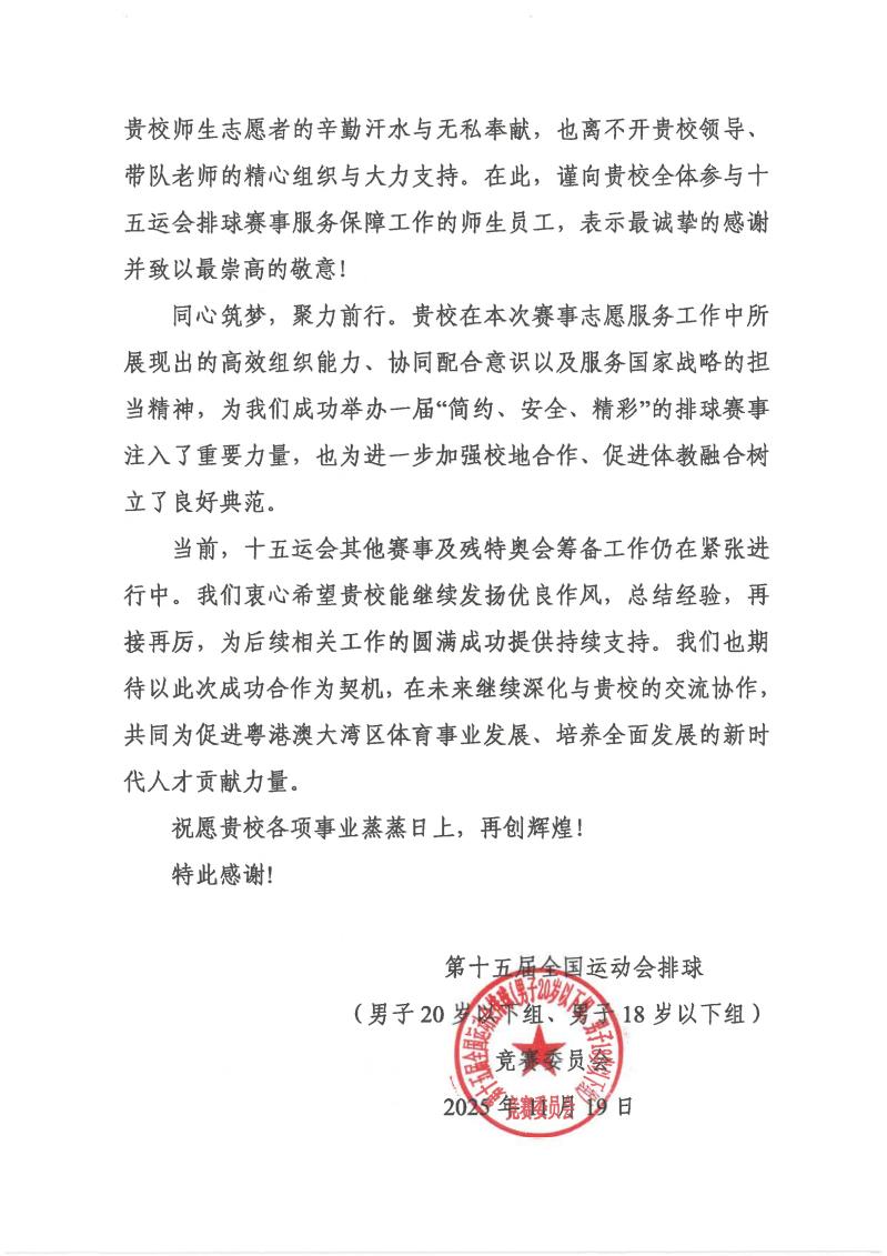 本网讯 近日,我校收到第十五届全国运动会排球(男子20岁以下组、男子18岁以下组)竞赛委员会发来的感谢信,对学校在赛事期间组织志愿者提供的卓越服务表示高度认可与衷心感谢。信中指出,在我校王黎明、徐燕萍、蒋珊、黄彦虹、李可喻、邱越等教师带领下,241名学生志愿者以高度的责任意识、专业的服务水准和饱满的工作热情为赛事顺利推进提供了坚实保障,赢得各方的一致好评,充分展现南国师生的担当与风采。