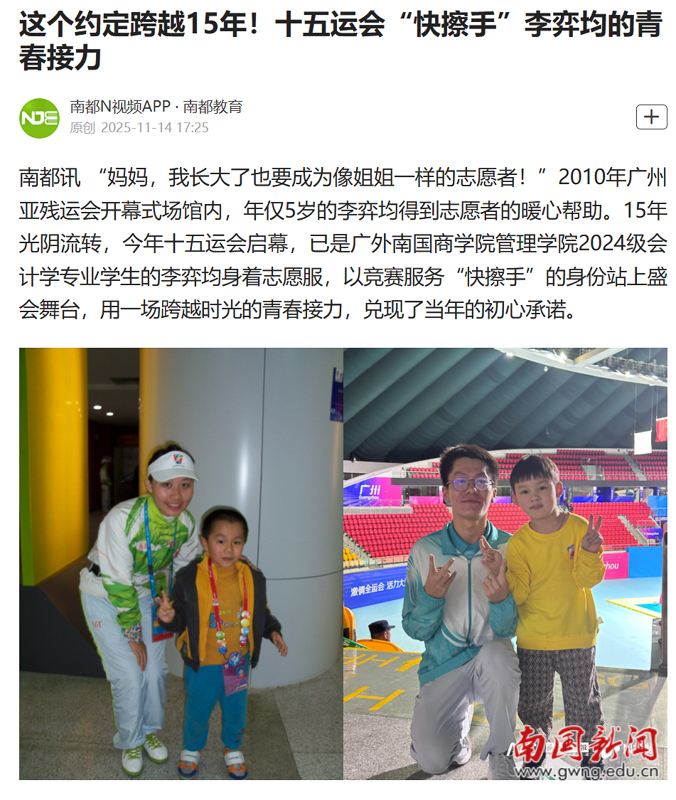 此次志愿服务不仅为十五运会的成功举办贡献了南国力量,也为学校深化实践育人积累了宝贵经验。目前,我校已有89名志愿者转战残特奥会开幕式服务岗位,继续以青春之我书写志愿新篇。校团委将持续发挥组织引领作用,推动志愿服务工作制度化、常态化、品牌化发展,引导广大南国学子在服务国家与社会的实践中成长成才。(通讯员 徐燕萍)