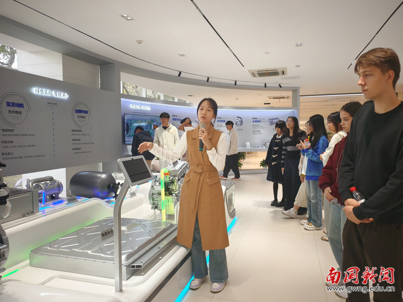 随后,在工作人员的引导下,国际学院师生们继续参观至广汽传祺展览馆。馆内陈列着多款代表车型,在讲解员的详细介绍下,同学们对广汽传祺从品牌创立至今的发展历程、核心技术以及未来战略有了初步了解。国际学院师生认真聆听讲解,对中国汽车工业的迅速崛起表现出浓厚兴趣。