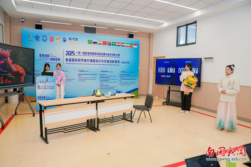 首届国际研学旅行课程设计与实施创新赛项以高水平赛事引领旅游教育高质量发展。本次全国总决赛设置了三大模块:模块一为研学旅行理论知识测试;模块二为研学旅行产品设计;模块三为研学旅行单元表演展示。比赛为期三天,全面考察了选手在课程创新、方案实施与国际沟通等方面的综合能力。竞赛过程严格规范、竞争激烈,在比赛中,我校代表队沉着应对各环节挑战,课程方案设计结构完整、内容新颖,现场展示环节结合岭南特色文化进行精心设计,展现出良好的团队协作与专业实践能力,获得了评委的高度认可。
