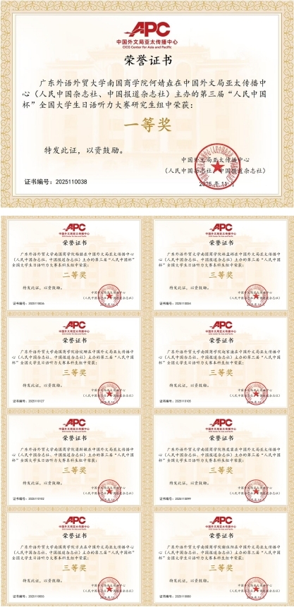 本网讯 近日,第三届“人民中国杯”全国大学生日语听力大赛获奖名单揭晓,我校学子共斩获九项大奖,包括研究生组一等奖1项、本科生组二等奖1项、三等奖7项。值得一提的是,我校学生不仅在本科生组刷新获奖记录,更是首次在研究生组别斩获一等奖,实现了在该赛事高级别奖项上的新突破。