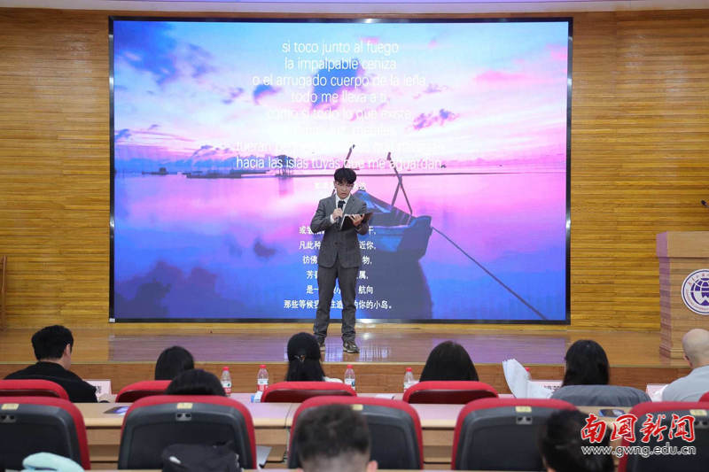 本网讯 12月4日下午,由广东外语外贸大学西班牙语系举办的2025年西班牙语日暨第四届“聂鲁达杯”诗歌朗诵大赛总决赛在广外白云山校区顺利举行。本届大赛旨在促进省内高校西班牙语专业交流,激发学生对西语文学的热情。吸引了来自全省九所高校的近五十名选手参与角逐。我校西班牙语系选派的三名学生凭借出色表现,在决赛中全员战火斩获奖项,载誉而归。