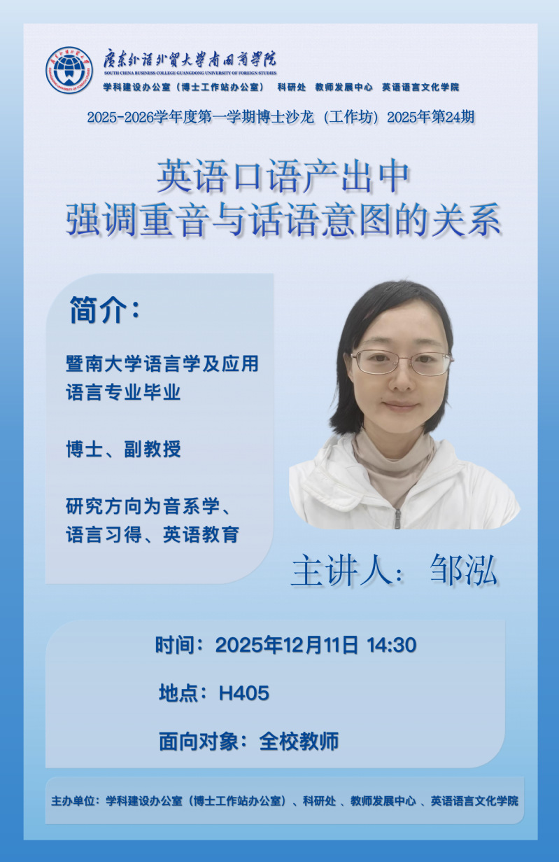 讲座主题:英语口语产出中强调重音与话语意图的关系