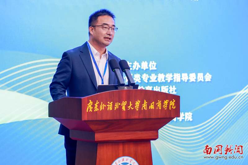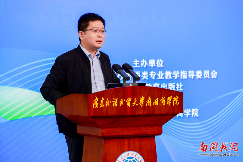 上海外语教育出版社华南大区兼西南大区朱义志副总经理代表联合主办单位致辞。他简要阐释了本次论坛的主题,并回顾了外教社近年来在搭建外语教育平台、助力人才培养方面取得的一系列成果。最后,他预祝论坛圆满成功,期待各位院长与学者在思想碰撞中收获丰硕。