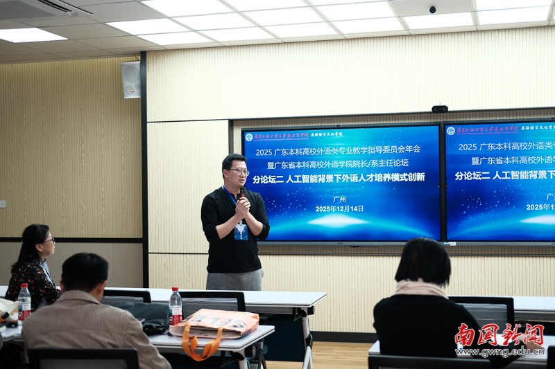 本网讯 2025年12月14日,广东省本科高校外语类专业教学指导委员会年会暨广东省本科高校外语学院院长/系主任论坛在我校国际学术报告厅举办。论坛由广东省本科高校外语类专业教学指导委员会与上海外语教育出版社联合主办,我校英语语言文化学院承办。论坛以“破局·立新——AI时代的外语人才培养”为主题,汇聚全省30余所高校的百余名外语教育专家,聚焦人工智能时代外语教育的转型路径与创新实践,通过主旨报告、平行论坛等多维度研讨,为构建“人机协同、文理融合”的外语教育新生态凝聚共识。