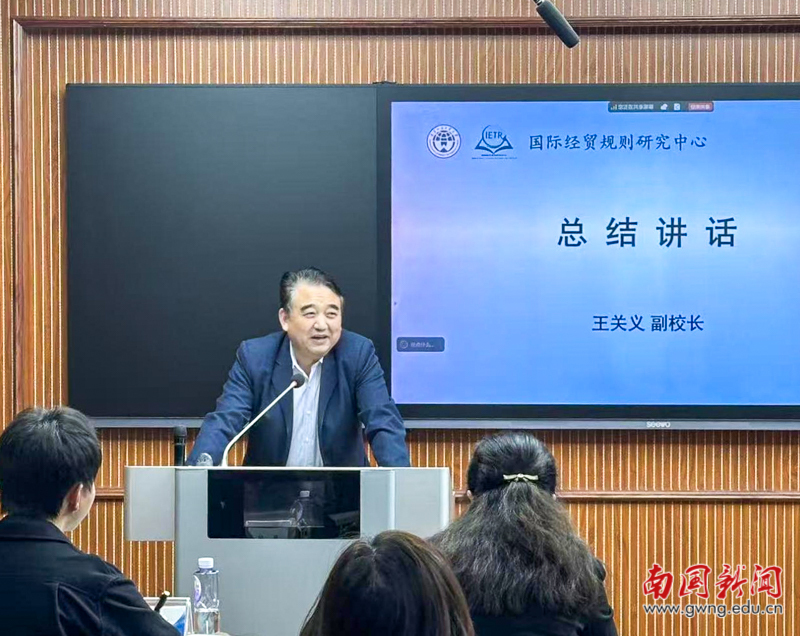 王关义发表总结讲话,对国际经贸规则研究中心取得的成效表示肯定,并对中心建设提出五点重要意见:一聚焦经济学院学科建设需求,进行有组织的科研;二聚焦中心研究领域,组建相应科研团队,产出高水平成果;三聚焦交叉融合发展局势,做好经济学院与科研平台的融合;四聚焦短板和新生队伍的培养,做好基本理论与大湾区经济发展现实研究的结合;五聚焦产教融合校企合作,加大与行业、企业家合作力度,走出校门进行实地调研。