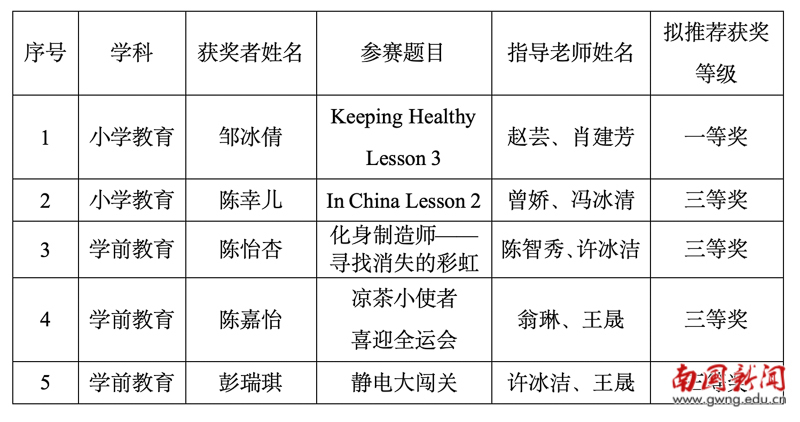 小学教育(英语)专业邹冰倩同学荣获一等奖,小学教育(英语)专业陈幸儿、学前教育专业陈怡杏、陈嘉怡、彭瑞琪4名同学获得三等奖。