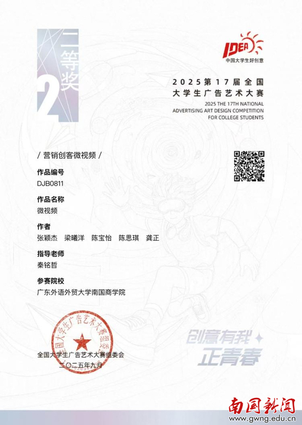 本网讯 近日,2025年第17届全国大学生广告艺术大赛(简称“大广赛”)获奖名单正式揭晓。我校文化与传播学院2023级播音与主持艺术(英文班)张颖杰、梁曦洋、陈宝怡、陈思琪、龚正五位同学组成的团队,在竞争激烈的营销创客类微视频赛道脱颖而出,凭借优质作品荣获全国二等奖。
