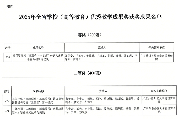 广东省优秀教学成果奖是全省教育教学领域的重要荣誉,专门表彰那些在教育教学改革与实践中取得突出成效、具有示范引领价值的优秀成果。这次我校获奖的三项成果,覆盖了外语、计算机、商科三大学科领域。一等奖成果《应用型高校“三融合・一贯通”外语人才培养体系创新与实践》,由池圣女、王家宝、于凤颖、王瑞英、吴丽、唐彤、温宾利、于恩泽、蔡海云等9位教师共同完成,聚焦外语人才培养与行业需求衔接的关键问题,创新构建了特色培养体系;朱子江、李俊山、胡毅、常静、赖益强、谢绍斌、曾显峰、杨德牛、廖晓芳、齐德昱等10位教师打造的《三位一体・三维联动・三元协同:民办高校计算机类专业“三三三”育人模式》,针对性解决了民办高校计算机类专业的育人短板;文佑云、王天、陈书星、高洁、吴海燕、夏海霞、党雪、吴新玲、王华、苏武俊等10位教师研发的《一体两翼・三维融合・四元协同:商科应用型人才培养模式改革与实践》,则为商科应用型人才培养提供了可借鉴的实践方案。