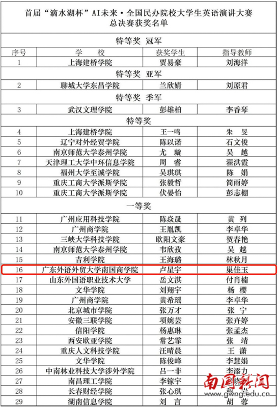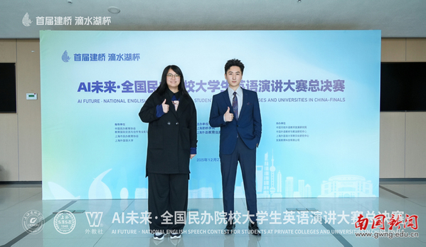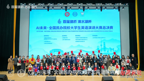 本网讯 2025年12月26日至28日,首届“滴水湖杯”AI未来·全国民办院校大学生英语演讲大赛总决赛在上海建桥学院举行。我校英文学院2025级英语(专升本)3班卢星宇同学(指导老师:巢佳玉、王菁)晋级全国总决赛,与全国18个省份80余所民办高校的29名优秀选手同台竞技,最终荣获全国总决赛一等奖。