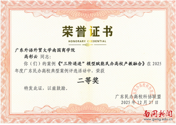 在科研处与教务处的共同组织下,我校此次共申报6个案例,其中3项成功获奖。西语学院高彩云撰写的《“三阶递进”模型赋能民办高校产教融合》获二等奖;国际经贸规则研究中心高洁、刘远、尹秀珍三位老师合作的《“四维三转”产学研协同育人赋能广州美妆产业出海》,以及计算机学院姜绪洁的《从工具到伙伴:AI智习室如何重塑学习本质——一场产教融合的育人实践》两个案例分获优秀奖。