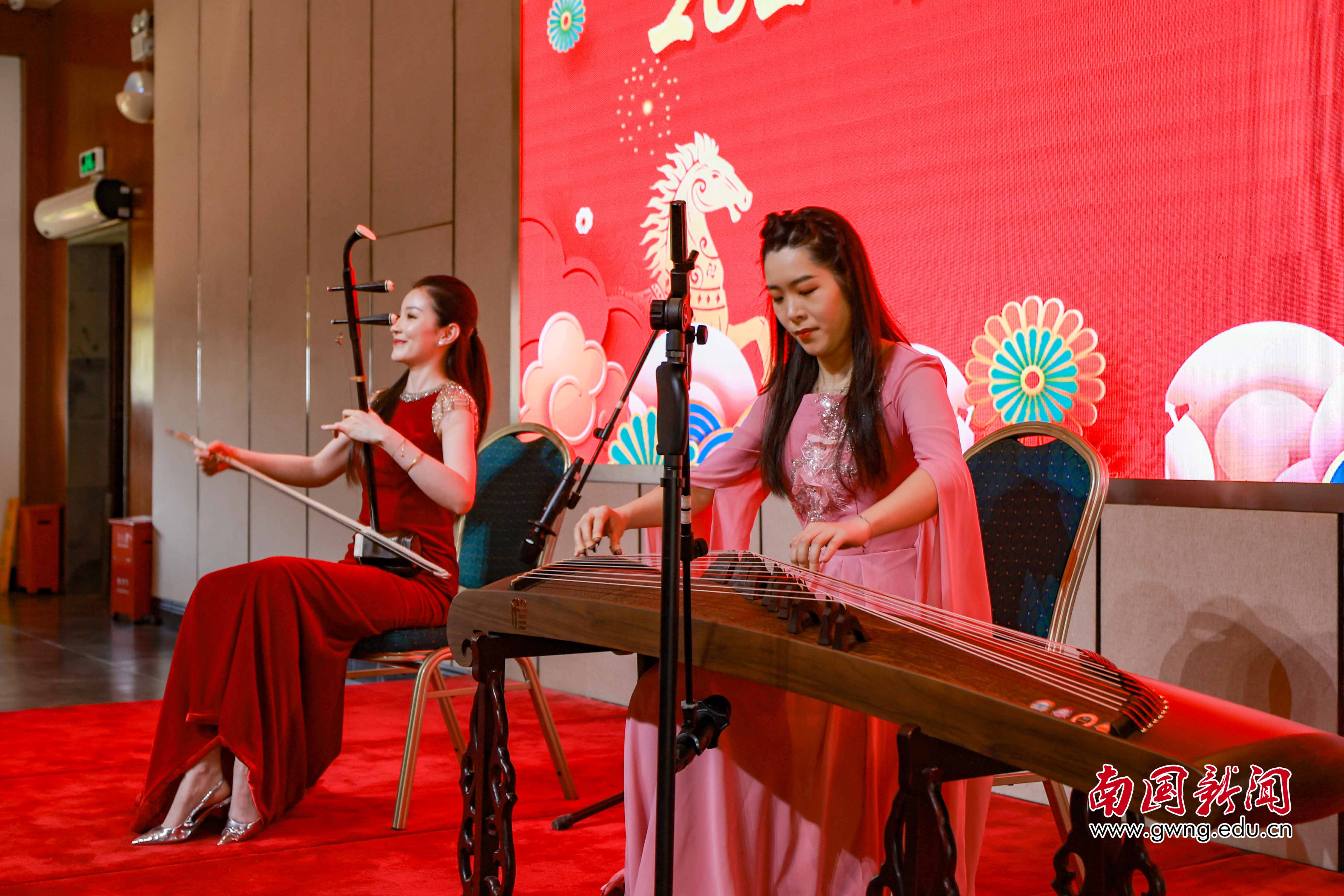 校长致辞后,全体校领导共同登台,举杯向在场同仁致以新春祝福,齐声祝愿南国事业蒸蒸日上,各位同仁万事如意。随后,大家共进午餐,品尝美味佳肴,并欣赏由艺术学院老师们带来的精彩表演。表演曲目紧扣马年新春主题,积极向上。一曲气势磅礴的二胡独奏《赛马》,以万马奔腾般的激昂旋律,奏响了龙马精神、一往无前的奋进号角,引来满堂喝彩。二胡与古筝合奏的经典曲目《步步高》,乐曲节奏明快,旋律昂扬向上,以和谐悦耳的丝弦之音,寄寓了对南国事业与全体同仁在新的一年里“步步高升”的美好祝福。