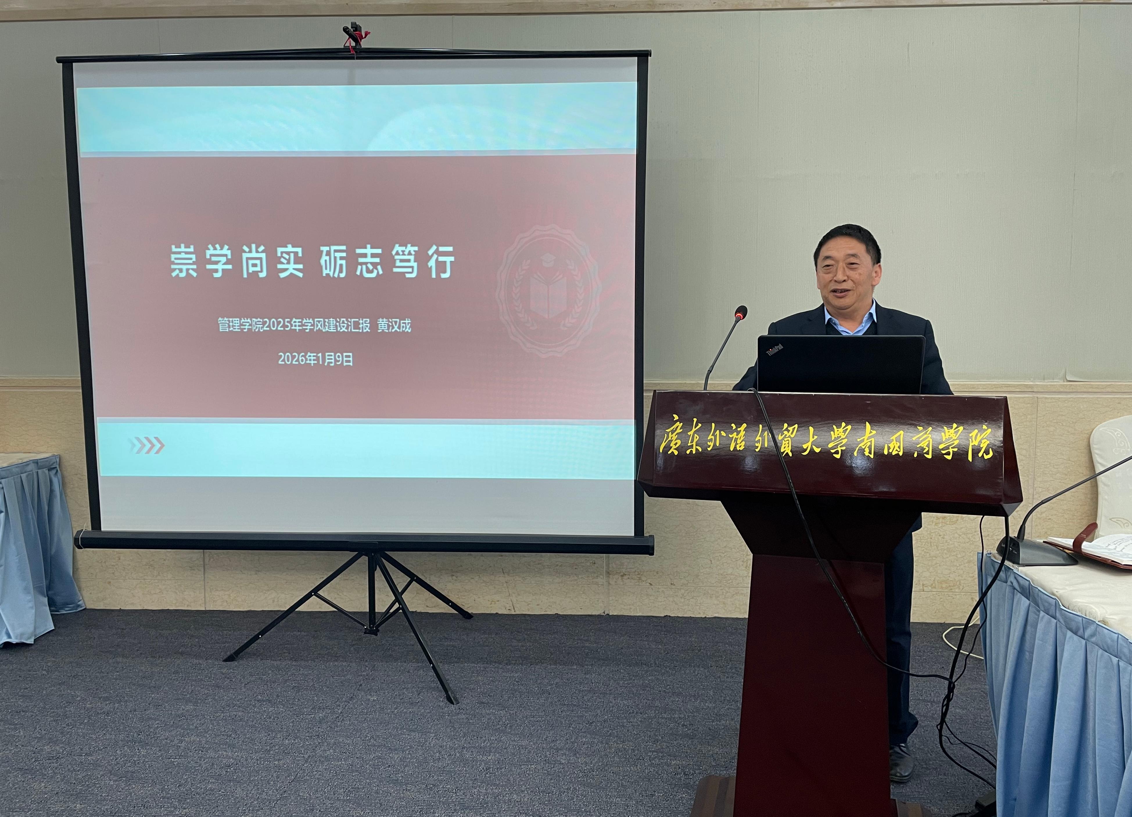 管理学院党总支书记黄汉成代表学风建设先进集体,以“崇学尚实,砺志笃行”为题分享学风建设经验。据介绍,管理学院以“五提高三减少”为目标,秉持“五维发力”思路,并开设ACCA特色班、推动学科竞赛,有效提升了学风建设实效与人才培养质量。