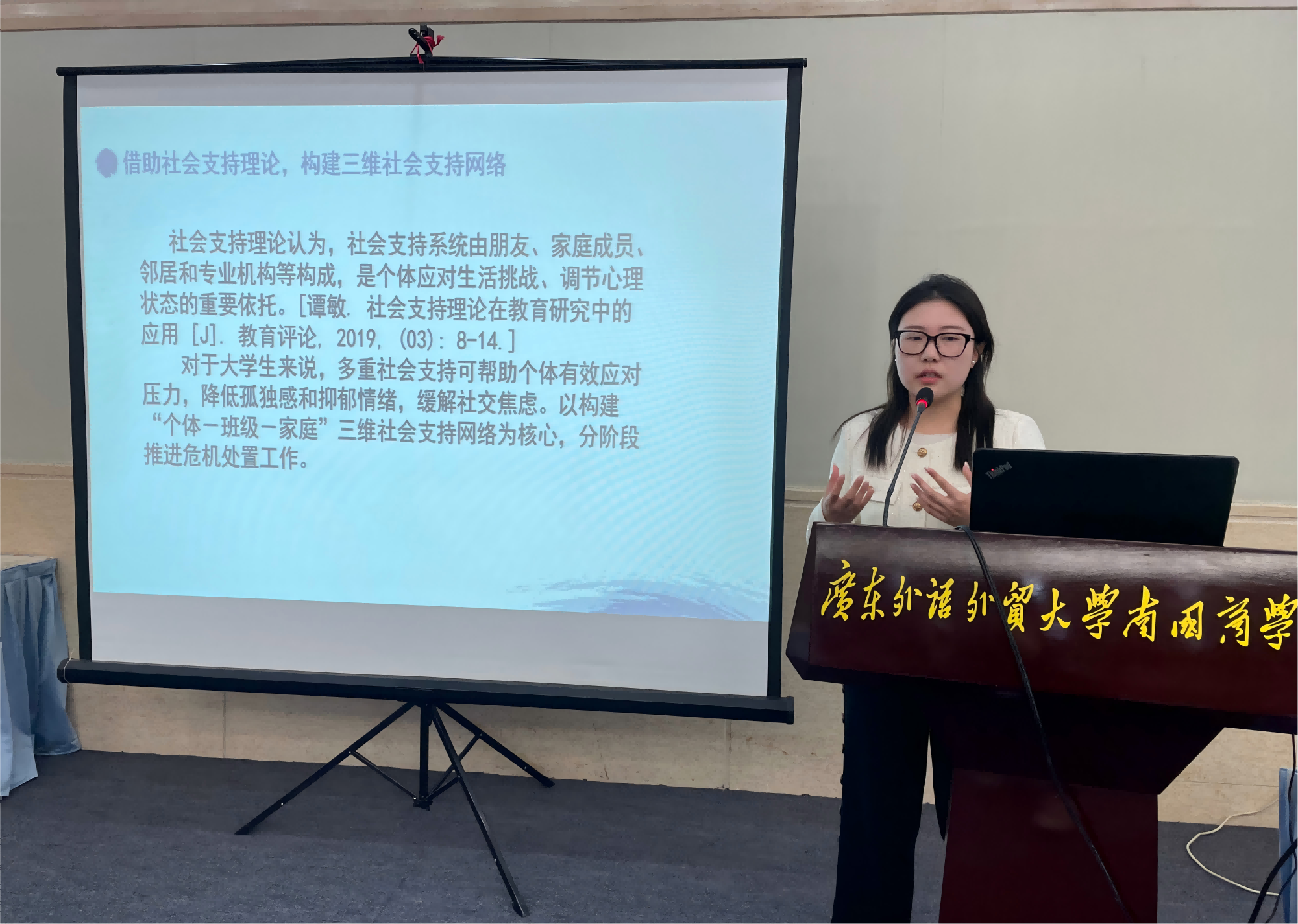 文化与传播学院梁秋燕老师的工作案例《聚焦综测争议化解,筑牢校园育人底线——大学生综合素质测评引发网络造谣诋毁事件处置与公信力修复》、英文学院陈惠斯老师的工作案例《记一名心境障碍学子的高校救赎之旅工作案例》、管理学院邓丹老师的工作案例《三年交心解困局资助育人显温情——毕业9年毕业生生源地贷款违约清偿工作案例》、计算机学院方思予老师的工作案例《从“偏激疏离”到“向阳融入”——社会支持理论视角下高校新生重度抑郁症危机干预》、国际学院刘淳媛老师的工作案例《从“挫败回避”逐渐到“向阳融入”——一例复读新生入学适应障碍干预工作案例》、西语学院麦素丹老师的工作案例《情财裂谷:基于“情理法事”的架桥与引领学生恋爱引发经济纠纷案例的引导和思考》获评优秀学生工作案例。