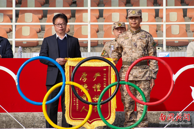 为感谢承训单位的大力支持与配合,许志超向承训单位赠送锦旗军训团团长侯文海代表承训单位接旗。