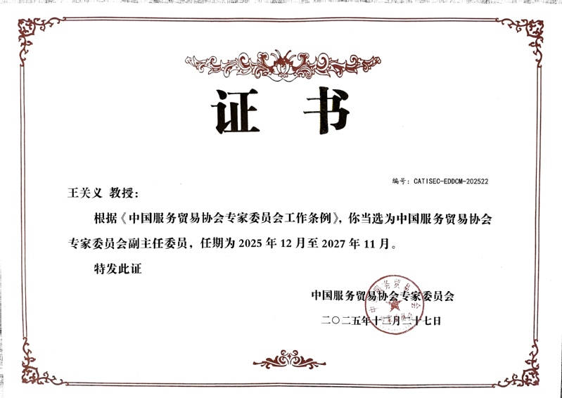 本网讯 近日,经中国服务贸易协会专家委员会评审遴选,我校副校长王关义教授当选中国服务贸易协会专家委员会副主任委员,任期至2027年11月。此次当选,既是业界对王关义教授学术领导力的高度肯定,也为我校国际经贸规则研究中心搭建了更广阔的国家级学术平台。